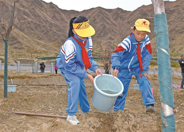 拉薩市第一小學(xué)學(xué)生在城關(guān)區(qū)慈覺(jué)林植樹(shù)點(diǎn)參加春日植樹(shù)活動(dòng)。記者 潘多 洛桑 攝