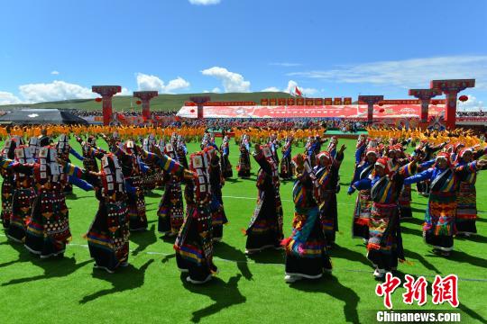 2019年8月10日,西藏那曲牧民參加一年一度的賽馬節(jié)。圖為當(dāng)?shù)嘏越M成的大型鍋莊舞團(tuán)隊(duì)在開(kāi)幕式上進(jìn)行表演。(資料圖) 江飛波 攝