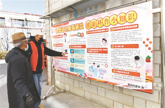 為大學生志愿者扎西平措在塔瑪小區(qū)內的宣傳欄前給路過的居民普及防控知識。。(本組圖片由拉薩融媒視覺組攝)