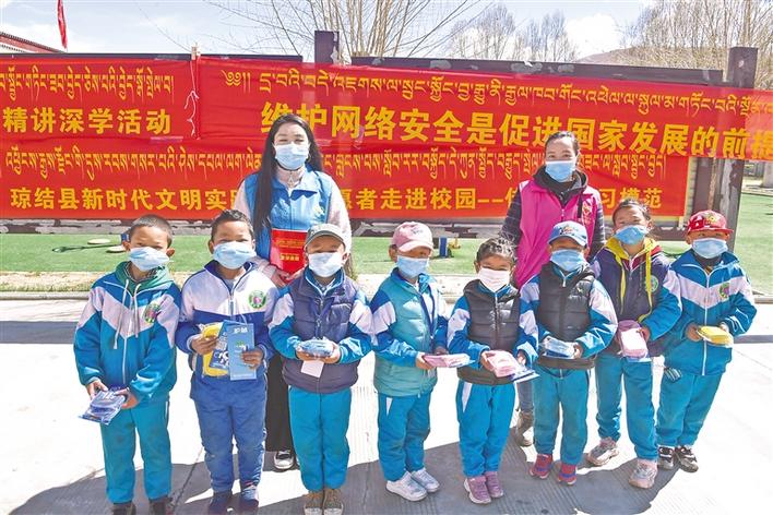 志愿者向瓊結(jié)鎮(zhèn)小學學生發(fā)放學習用具,開展“綠書簽”活動。記者 洛桑 次旺 攝