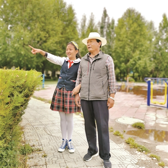 圖為朱汀娜陪姥爺在公園散步。拉薩融媒記者 王雪攝