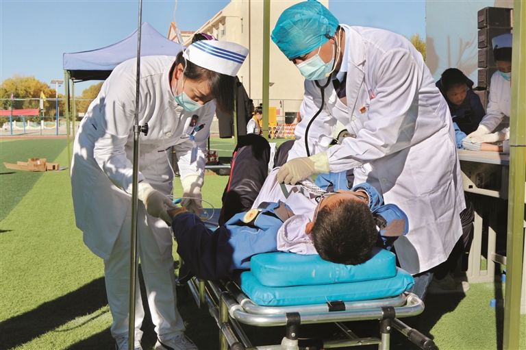 圖為在演練現(xiàn)場,醫(yī)生正在對“中毒”學(xué)生進(jìn)行診療、救治。 拉薩融媒記者 龍俊霖攝