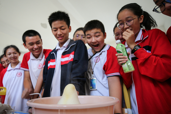 10月26日,北京師范大學(xué)??诟綄賹W(xué)校的學(xué)生參與化學(xué)趣味實(shí)驗(yàn)。當(dāng)日,北京師范大學(xué)海口附屬學(xué)校舉行第三屆科技人文節(jié)活動(dòng),在校內(nèi)營(yíng)造愛(ài)科學(xué)、學(xué)科學(xué)的良好氛圍。
