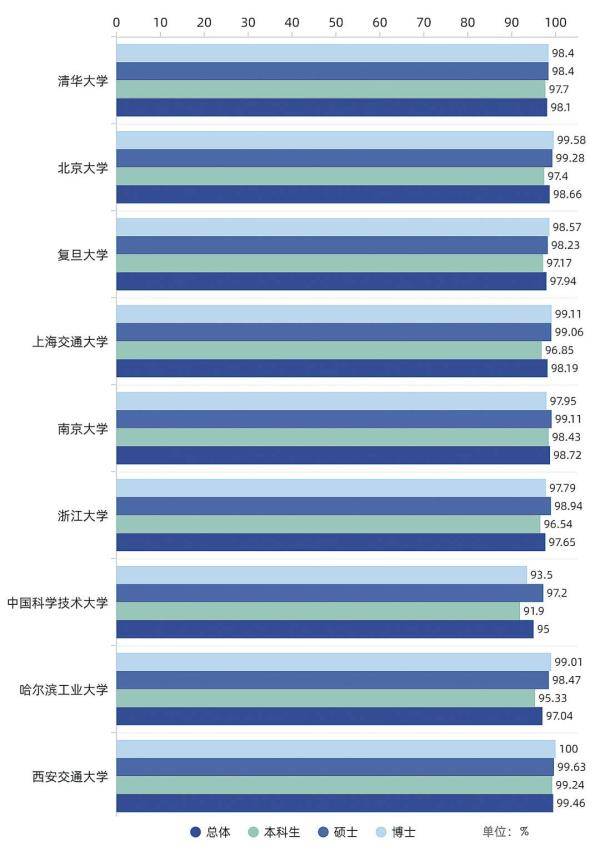 其中,最高的是西安交通大學,畢業(yè)生就業(yè)率達99.46%;最低的是中國科學技術大學,畢業(yè)生就業(yè)率為95%。