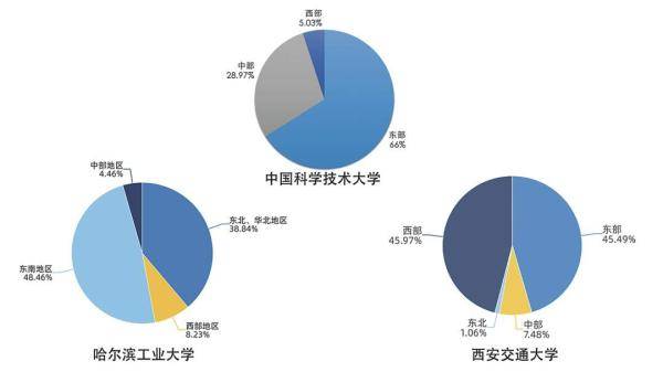 圖3.中國科大、哈工大、西安交大2019屆畢業(yè)生就業(yè)地區(qū)分布