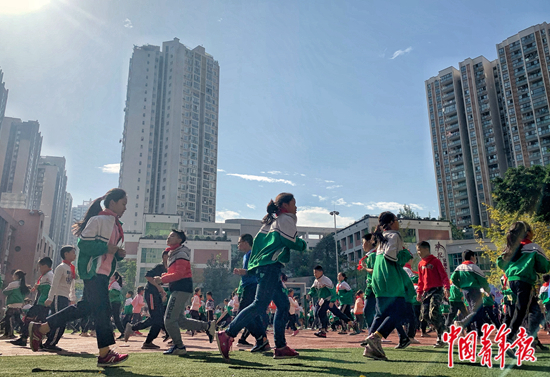 四川成都電子科技大學(xué)附屬實驗小學(xué)的學(xué)生在進(jìn)行體育鍛煉。梁璇/攝