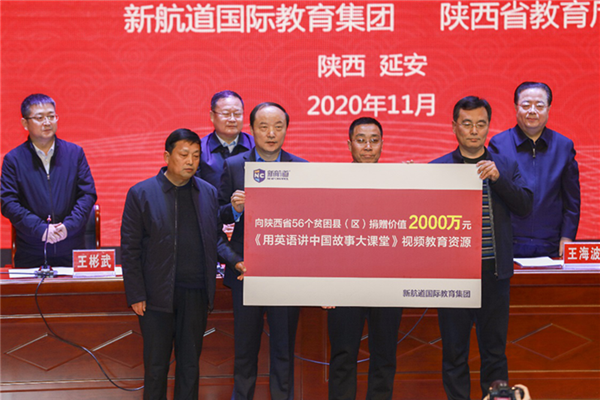 2020年是脫貧攻堅的決戰(zhàn)決勝之年。繼陜西省56個貧困縣(區(qū))全部實現(xiàn)“脫貧摘帽”之后,又收到一份教育大禮——由新航道國際教育集團捐贈的價值2000萬元的《用英語講中國故事》視頻課程。當天,陜西省教育廳副廳長王海波與新航道國際教育集團董事長兼CEO胡敏共同出席在宜川中學舉行的捐贈儀式,開啟新航道國際教育集團助力陜西教育扶貧的新篇章。