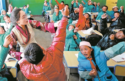教學(xué)中,桑丁卓瑪注意活躍課堂氣氛,調(diào)動(dòng)學(xué)生的學(xué)習(xí)積極性。一堂漢語文課上,她引導(dǎo)學(xué)生根據(jù)課文描述,模仿主人公拉弓射箭的動(dòng)作。