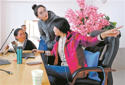 培訓(xùn)過程中,授課專家、中國教育科學(xué)研究院教師發(fā)展研究所副所長卿素蘭博士(右一)由于高原反應(yīng),身體出現(xiàn)不適,桑丁卓瑪臨時(shí)客串起“助教”,幫助調(diào)試教學(xué)設(shè)備、進(jìn)行范文朗讀等。