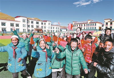 和學(xué)生們在一起,是桑丁卓瑪最開心的時(shí)刻。她專門給學(xué)生帶來國旗、國旗貼,為他們講述國旗下民族團(tuán)結(jié)好故事。