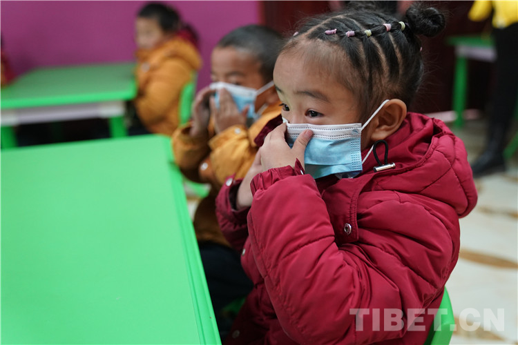 圖為那曲比如縣第一幼兒園孩子們學(xué)習(xí)戴口罩 攝影:王淑