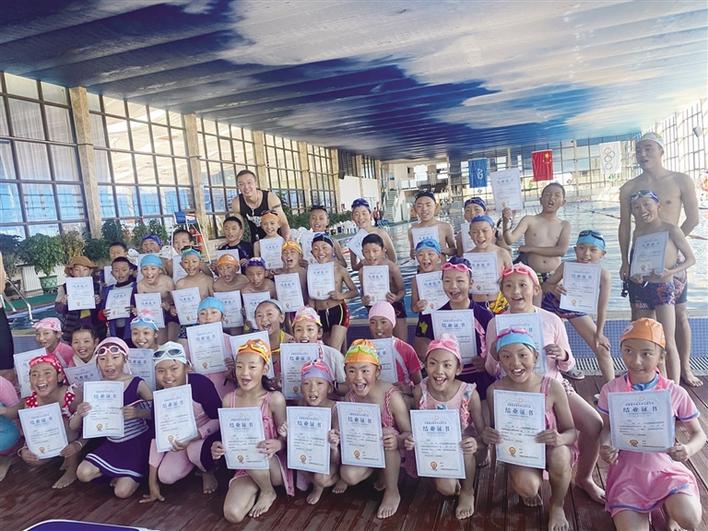 一批小學生完成游泳培訓拿到證書。