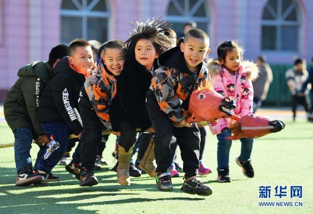 12月14日,河北省樂(lè)亭縣第三幼兒園的孩子們?cè)谕骝T竹馬游戲。新華社記者 牟宇 攝