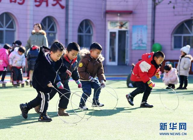 12月14日,河北省樂(lè)亭縣第三幼兒園的孩子們?cè)谕鏉L鐵環(huán)游戲。