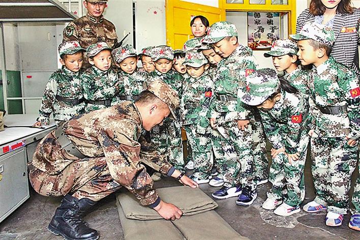 圖為日喀則軍分區(qū)某團(tuán)官兵為小學(xué)生們演示疊軍被。