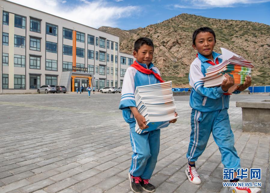 在山南市貢嘎縣森布日幸福家園九年一貫制學(xué)校,剛開學(xué)的孩子們搬新書(8月24日攝)。新華社記者 孫非 攝