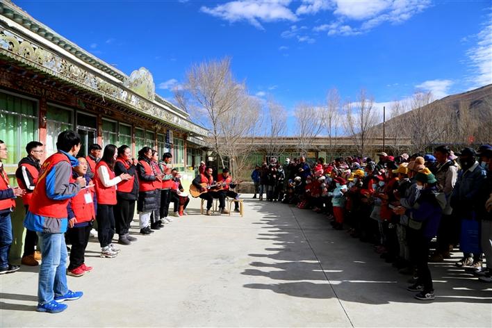 圖為志愿者和孩子們一起合唱歌曲《讓世界充滿愛》。 倫珠澤仁 洛桑 攝