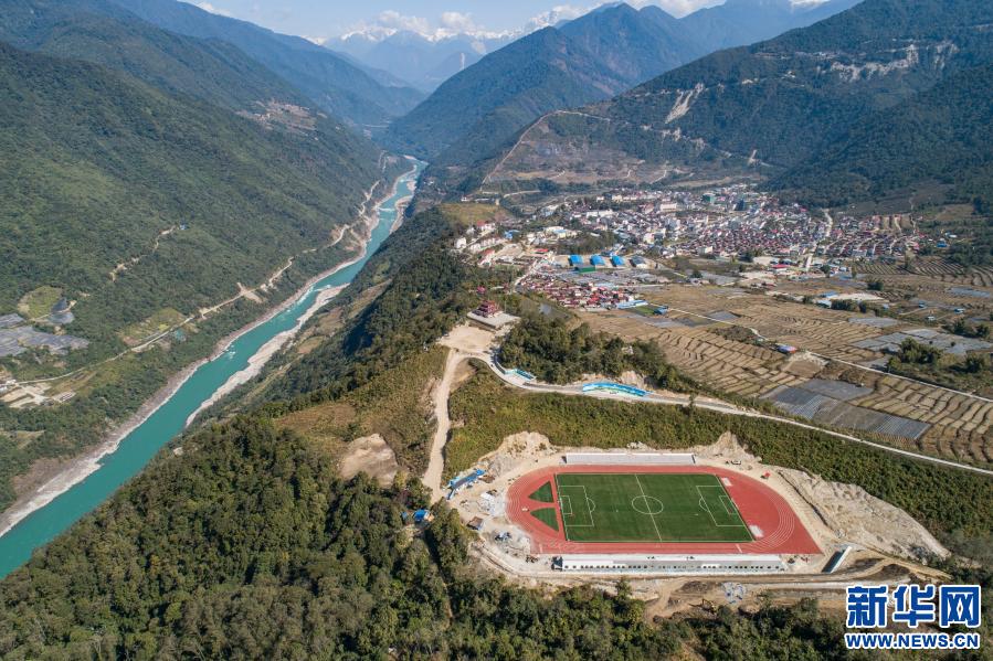 墨脫縣新建的11人制足球場(chǎng)位于雅魯藏布江邊(2月13日攝,無人機(jī)照片)。新華社記者 孫非 攝
