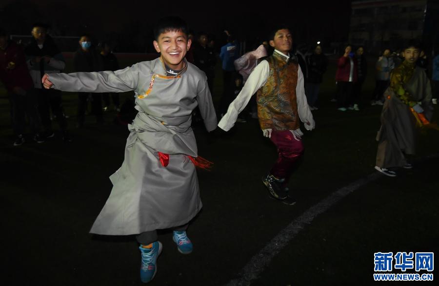 12日晚,夜幕降臨,華燈初上。伴隨著歡快的音樂(lè)聲,武漢西藏中學(xué)操場(chǎng)上,學(xué)生們變換著各種舞姿歡慶藏歷新年。