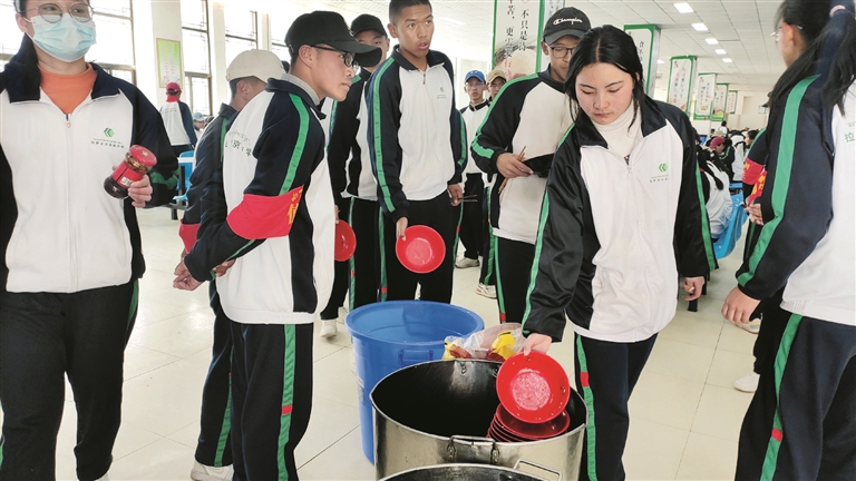 中午13時,在拉薩北京實驗中學食堂里,學生有序排隊取餐,根據(jù)“吃多少拿多少”的原則進行點餐。用餐結束后,學生排隊放置碗筷,記者注意到,大多數(shù)學生用過的餐碗非常干凈,沒有浪費主食的情況,用來裝食物殘渣的泔水桶里并沒有多少被倒掉的殘羹剩飯。