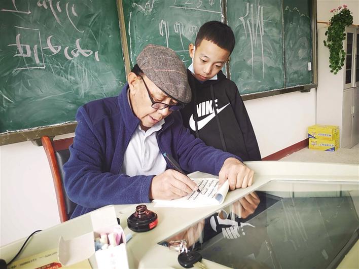 老師正在教學生藏文書法。記者 張雪芳 攝影報道