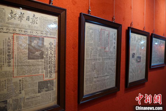 “這份最為寶貴,”索昂生格指著廊邊的第一幅相框,是《新華日?qǐng)?bào)》1949年10月2日的報(bào)紙,頭版“中央人民政府宣告成立”大字醒目,“它見證了歷史?!?/p>