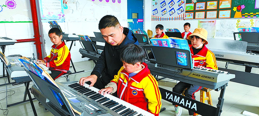 “我會(huì)教他們認(rèn)樂譜、怎么卡節(jié)奏、唱什么聲部,經(jīng)過長期堅(jiān)持學(xué)習(xí),孩子們進(jìn)步很快。”周得彤邊指導(dǎo)學(xué)生彈奏電子琴的指法,邊笑著和我們聊到,自從2017年,學(xué)校配備了專門的音樂教室,每堂課他都會(huì)堅(jiān)持使用樂器,以此來培養(yǎng)孩子們的音樂素養(yǎng),效果非常不錯(cuò)。