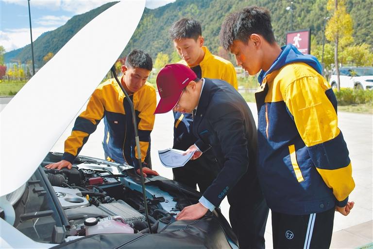 汽修班的老師和學生現(xiàn)場演示如何排除汽車故障。