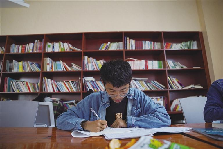 除了教室,閱覽室也是學(xué)習(xí)的好地方。在閱覽室,不少同學(xué)正奮筆疾書(shū),只聽(tīng)得見(jiàn)書(shū)頁(yè)翻動(dòng)和筆尖書(shū)寫(xiě)的“沙沙”聲。陽(yáng)光透過(guò)玻璃傾瀉在書(shū)桌上,暖暖地照在這些青春的面龐,把他們點(diǎn)綴成五月里最美的風(fēng)景。閱覽室的最里邊,一位老師正在認(rèn)真講解試卷上的難題,不一會(huì)兒同學(xué)們就露出了恍然大悟的表情?!拔液芟矚g來(lái)閱覽室學(xué)習(xí),這兒比教室更安靜些,可以讓我靜下心來(lái)做題?!睂W(xué)生扎西江村說(shuō)。