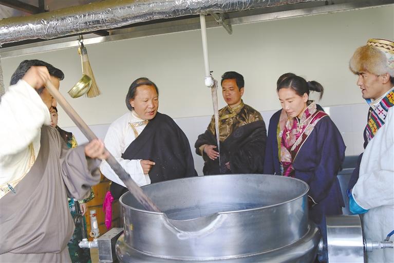 圖為國(guó)家級(jí)非物質(zhì)文化遺產(chǎn)代表性項(xiàng)目——藏醫(yī)藥浴法傳承人明珠(左二)指導(dǎo)學(xué)生(制藥師)煎熬“五味甘露”。山南市藏醫(yī)醫(yī)院供圖