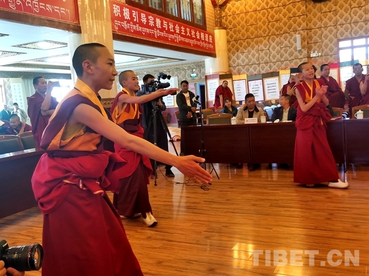 據(jù)了解,與傳統(tǒng)寺廟教育相比,西藏佛學(xué)院開設(shè)有文化課和佛學(xué)兩大體系,天資聰慧的少年活佛們在校期間已經(jīng)開始研習(xí)含義深刻、博大精深的《五部大論》《入菩薩行論》等佛教經(jīng)典作品,目前已經(jīng)可以流暢地背誦部分經(jīng)典。在當(dāng)日的學(xué)習(xí)成果匯報展示會上,少年活佛們不僅展示了藏漢雙語朗誦、藏漢文書法、英語情景劇等,也為大家?guī)砹恕度肫兴_行論》第一章的背誦展示和辯經(jīng)展示。