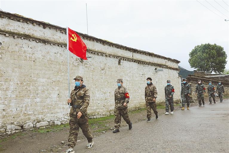圖為扎雪村民兵隊伍在村莊內(nèi)巡邏。通訊員 洛克 攝
