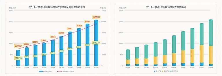 經(jīng)濟(jì)健康快速發(fā)展,地區(qū)生產(chǎn)總值由2012年的710.16億元增長至2021年的2080.17億元。十年來,西藏地區(qū)生產(chǎn)總值增長了152.6%,年均增長9.7%。