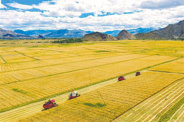 努力把資源優(yōu)勢轉(zhuǎn)化為發(fā)展優(yōu)勢,做大做強(qiáng)高原特色產(chǎn)業(yè),加快構(gòu)建現(xiàn)代產(chǎn)業(yè)體系。2012年至2021年,城鎮(zhèn)居民和農(nóng)村居民人均可支配收入分別從18362元、5698元增長至46503元、16932元。圖為西藏自治區(qū)江孜縣紫金鄉(xiāng)青稞種植喜獲豐收。
