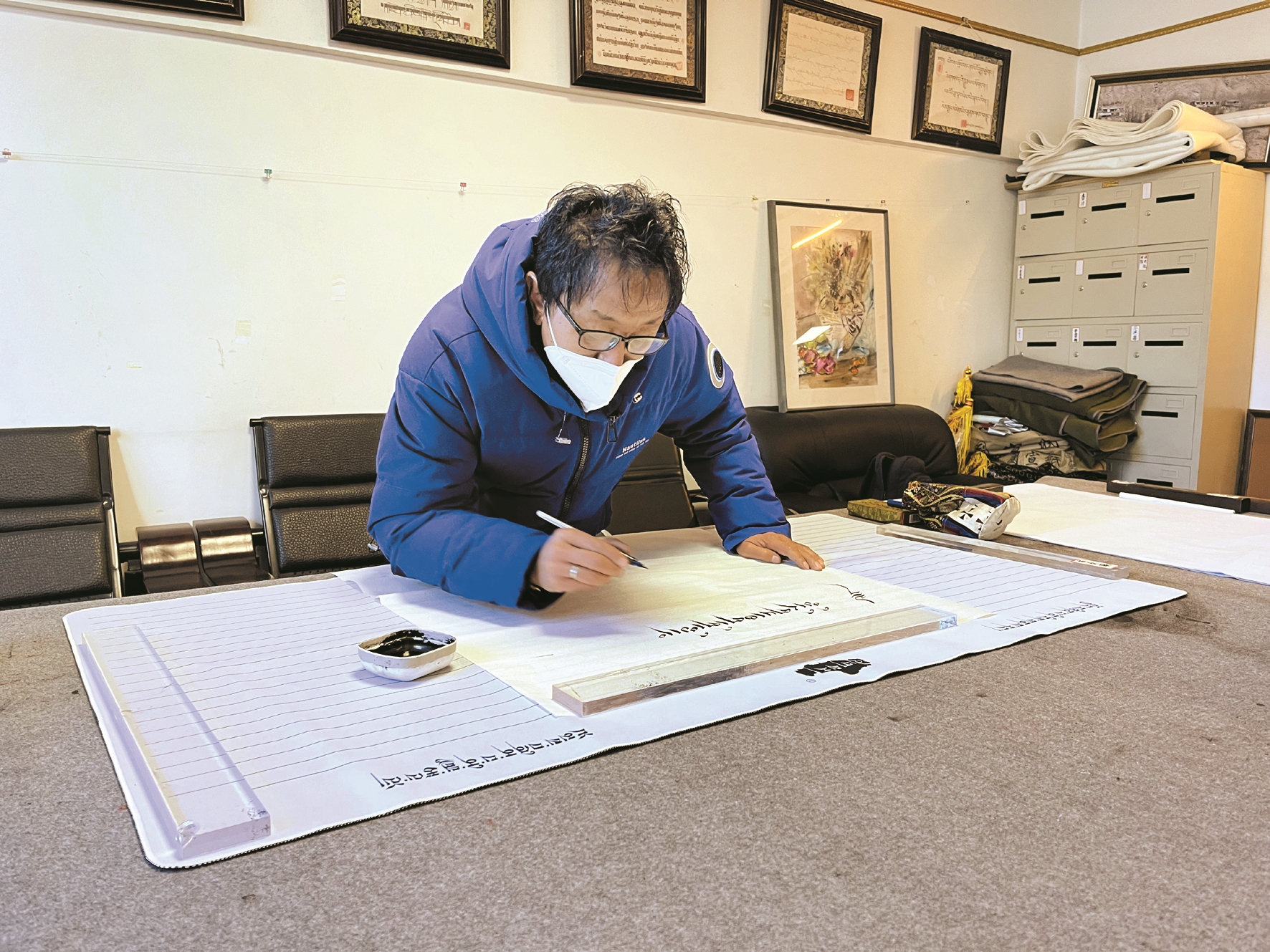 圖為市書(shū)法家協(xié)會(huì)副主席南杰旺扎正在書(shū)寫(xiě)黨的二十大報(bào)告金句。 拉薩融媒記者 莫瑞英攝