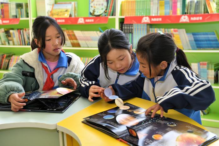 藥山鎮(zhèn)中心小學(xué)的同學(xué)們在新閱讀室閱讀新書。