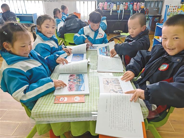圖為孩子們興致勃勃地閱讀獲贈(zèng)的書籍。