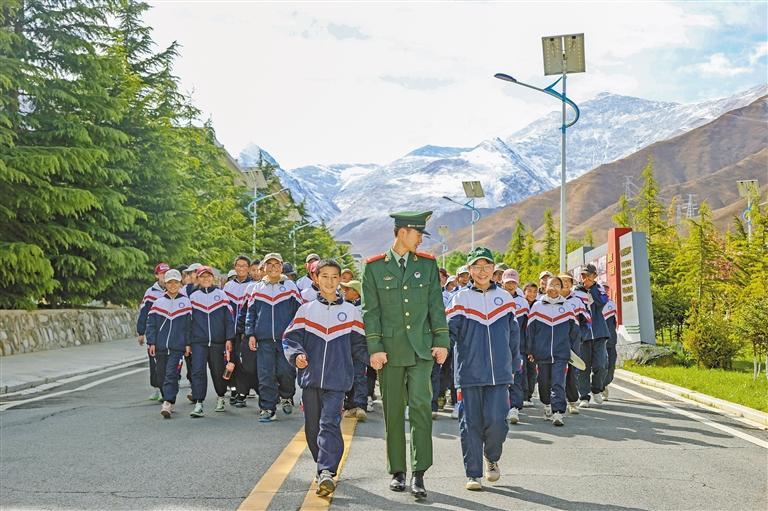 武警官兵帶領(lǐng)學(xué)生參觀營區(qū)。索朗旺堆 記者 旦增蘭澤 攝