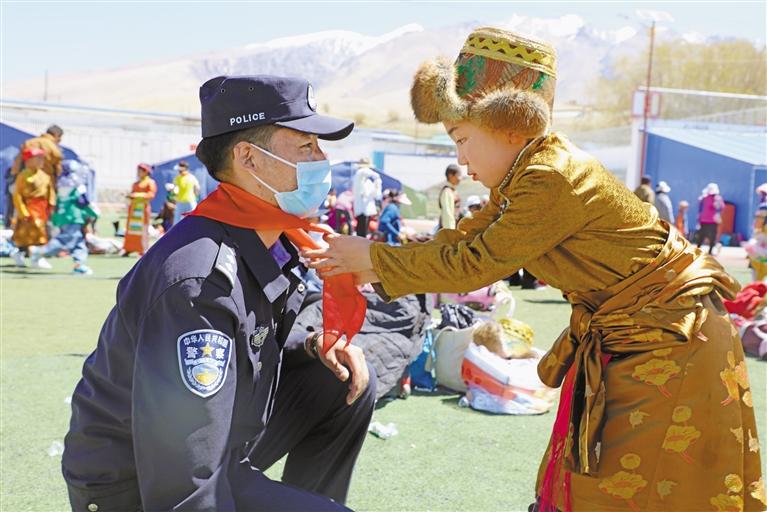圖為小學(xué)生為民警戴紅領(lǐng)巾。
