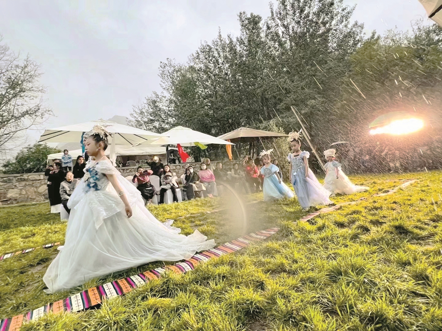 模特秀上,盡管天公不作美下起了雨,但小模特們跟隨著動感十足的韻律在雨中自信走秀,燃爆全場,極具個(gè)性色彩的藏族與苗族服裝展現(xiàn)了傳統(tǒng)文化與時(shí)尚設(shè)計(jì)的交相輝映,凸顯出“傳統(tǒng)與新潮”的極度融合,體現(xiàn)了“各美其美,美美與共”的文化關(guān)聯(lián)。