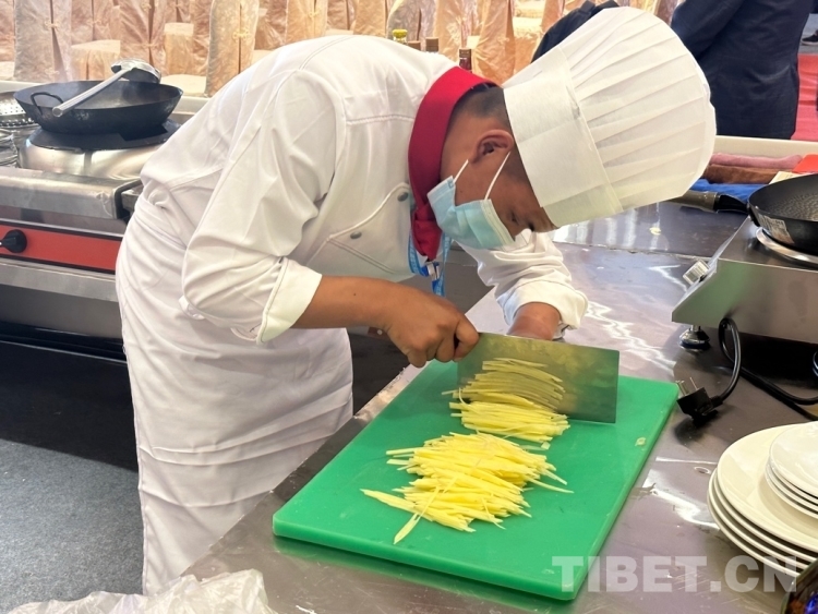 圖為來自阿里地區(qū)中等職業(yè)技術(shù)學(xué)校的參賽選手桑杰元旦在切土豆絲 攝影:旦曲