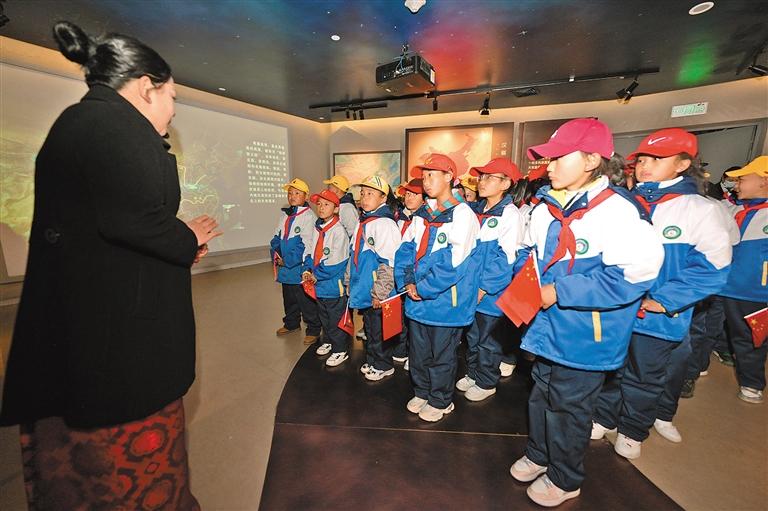 圖為拉薩市堆龍德慶區(qū)乃瓊中心小學(xué)的學(xué)生參觀百萬農(nóng)奴解放紀(jì)念館。記者 潘多 攝