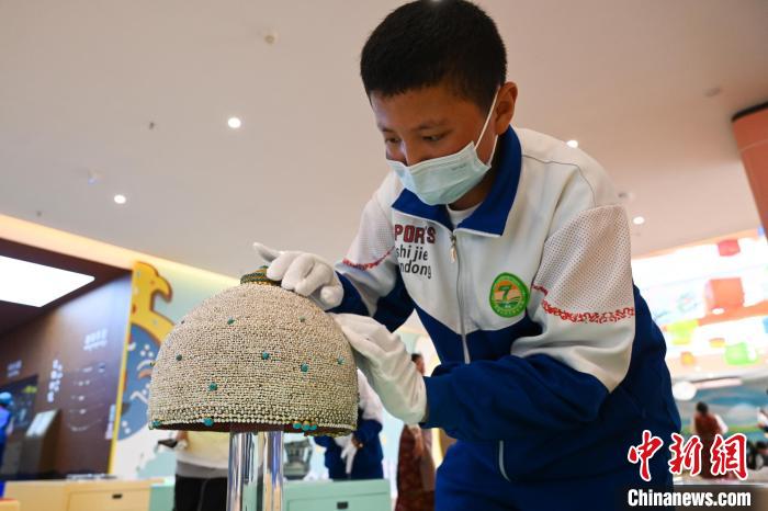 2022年7月,一名學生在西藏博物館觸摸體驗仿真文物。中新社記者 趙朗 攝