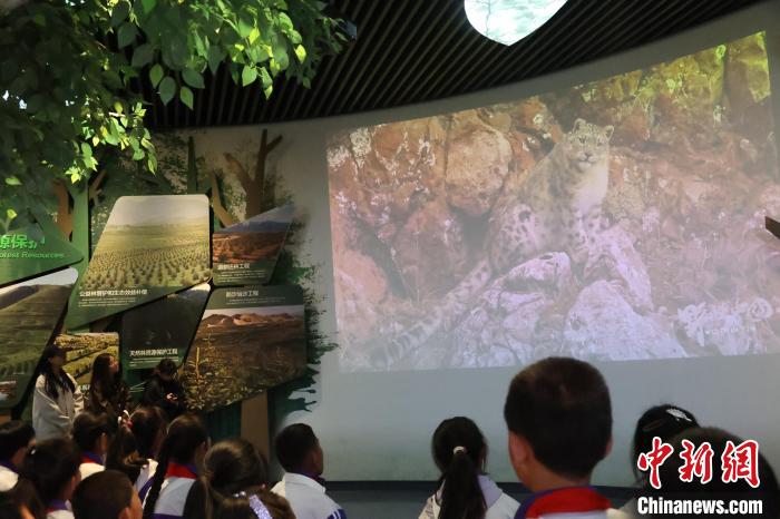 圖為青少年觀看高原旗艦物種雪豹的視頻。張?zhí)砀?攝