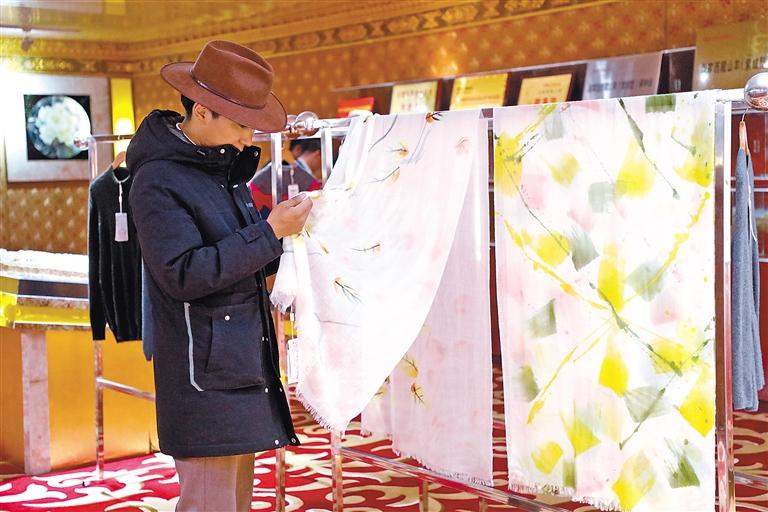 圖為消費(fèi)者在措勤縣絨山羊良種擴(kuò)繁養(yǎng)殖場展覽廳挑選“金紫絨”羊絨制品。記者 永青 攝