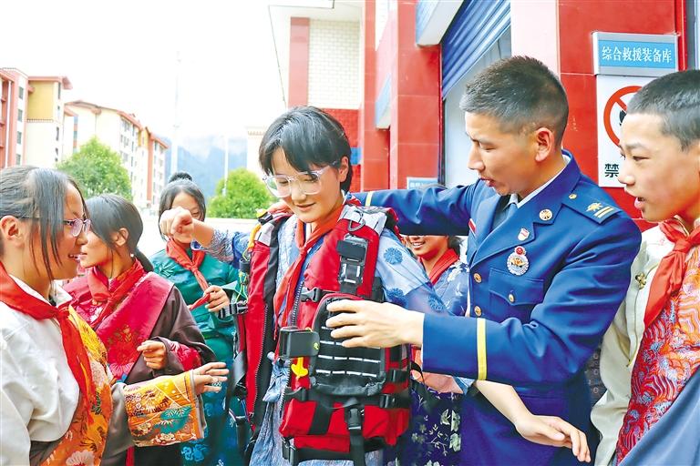學生體驗水域救援裝備。記者 胡文 通訊員 西繞拉翁 袁勇彬 攝
