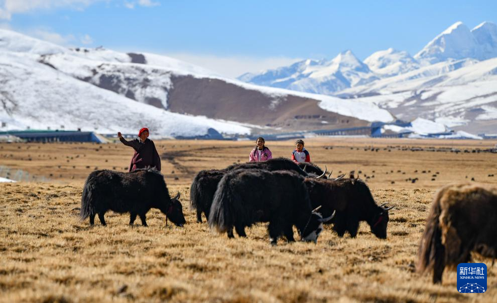 斯曲卓瑪(中)和爸爸、妹妹一起在草原上放牧(11月15日攝)。新華社記者 晉美多吉 攝