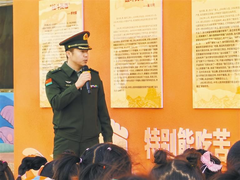 圖為西藏軍區(qū)某部干部袁文韜為拉薩市城關(guān)區(qū)第四幼兒園的師生們講解英雄墻上的英勇事跡。記者 武沛濤 攝
