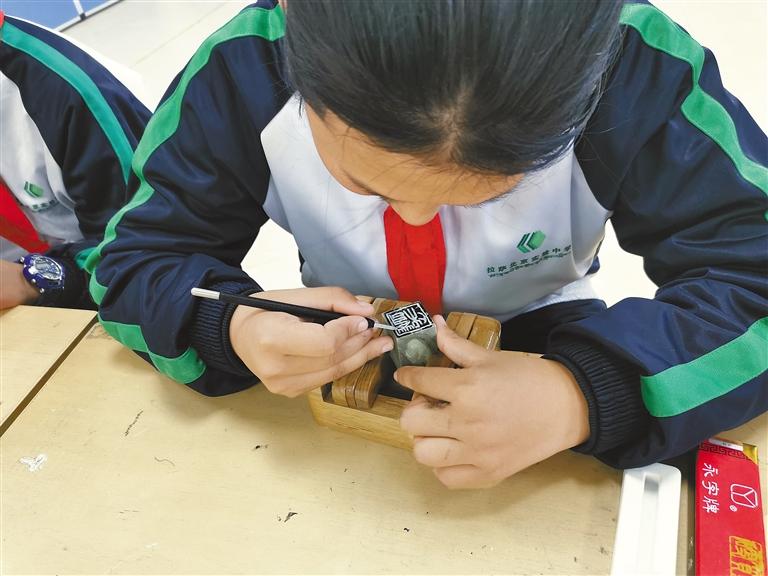 圖為學生學習篆刻技法。
