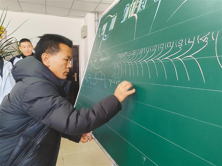 圖為洛桑多吉老師為學生們傳授藏文書法知識。